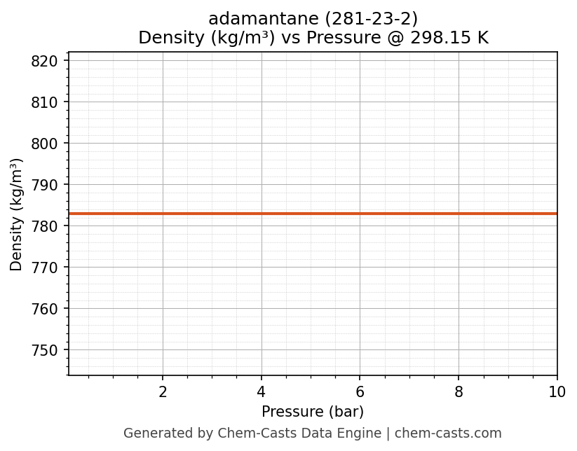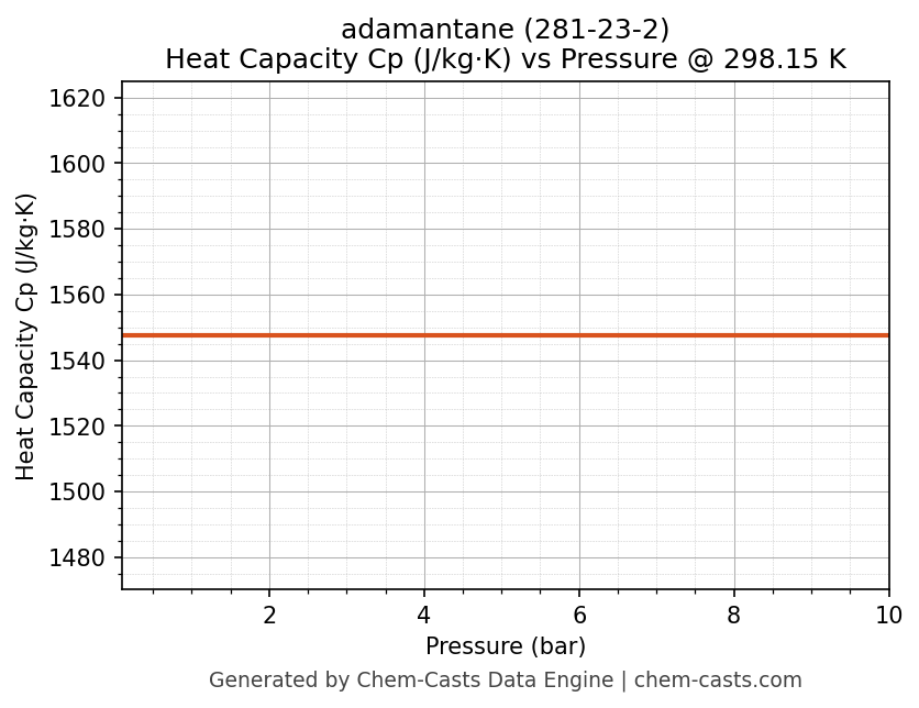 This page presents the pressure-dependent thermodynamic and transport properties of adamantane (CAS 281-23-2) calculated at a constant temperature of 298 K (25 °C) over the pressure range 0.10-10 bar.