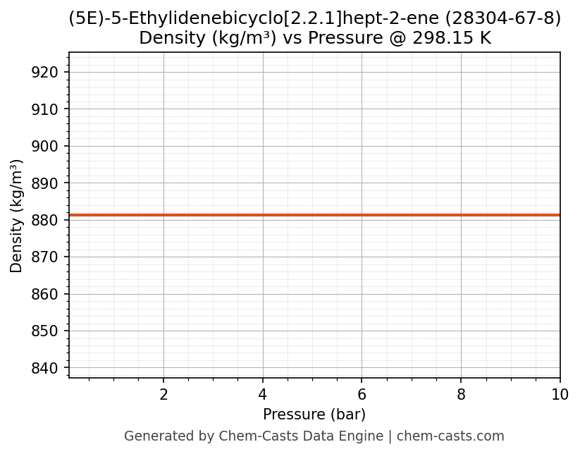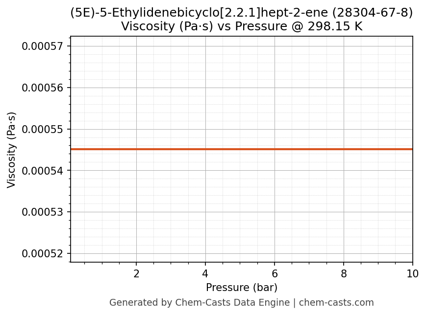 This page presents the pressure-dependent thermodynamic and transport properties of (5E)-5-Ethylidenebicyclo[2.2.1]hept-2-ene (CAS 28304-67-8) calculated at a constant temperature of 298 K (25 °C) over the pressure range 0.10-10 bar.
