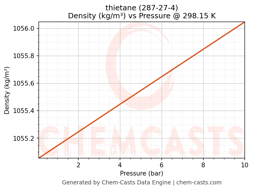 This page presents the pressure-dependent thermodynamic and transport properties of thietane (CAS 287-27-4) calculated at a constant temperature of 298 K (25 °C) over the pressure range 0.10-10 bar.