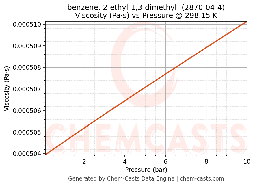 This page presents the pressure-dependent thermodynamic and transport properties of benzene, 2-ethyl-1,3-dimethyl- (CAS 2870-04-4) calculated at a constant temperature of 298 K (25 °C) over the pressure range 0.10-10 bar.
