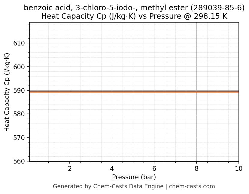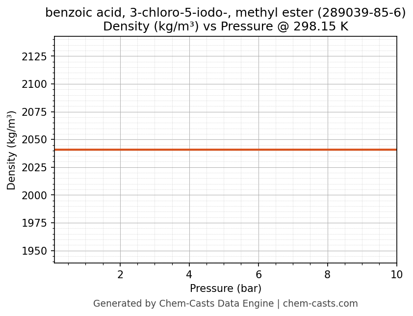 This page presents the pressure-dependent thermodynamic and transport properties of benzoic acid, 3-chloro-5-iodo-, methyl ester (CAS 289039-85-6) calculated at a constant temperature of 298 K (25 °C) over the pressure range 0.10-10 bar.