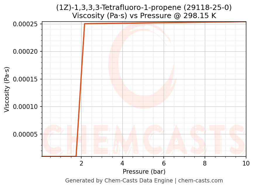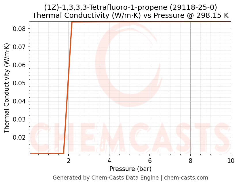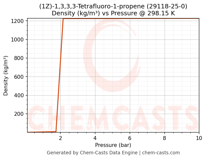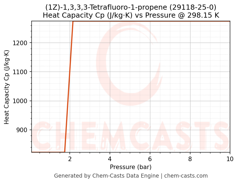 This page presents the pressure-dependent thermodynamic and transport properties of (1Z)-1,3,3,3-Tetrafluoro-1-propene (CAS 29118-25-0) calculated at a constant temperature of 298 K (25 °C) over the pressure range 0.10-10 bar.