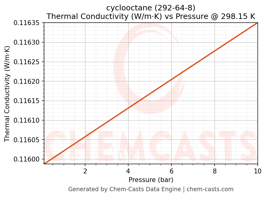 This page presents the pressure-dependent thermodynamic and transport properties of cyclooctane (CAS 292-64-8) calculated at a constant temperature of 298 K (25 °C) over the pressure range 0.10-10 bar.