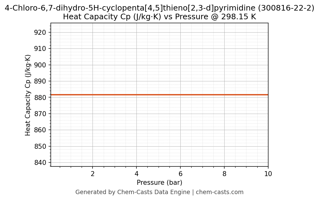 This page presents the pressure-dependent thermodynamic and transport properties of 4-Chloro-6,7-dihydro-5H-cyclopenta[4,5]thieno[2,3-d]pyrimidine (CAS 300816-22-2) calculated at a constant temperature of 298 K (25 °C) over the pressure range 0.10-10 bar.