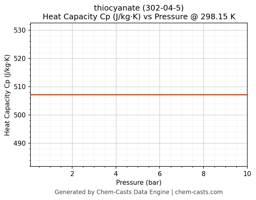 This page presents the pressure-dependent thermodynamic and transport properties of thiocyanate (CAS 302-04-5) calculated at a constant temperature of 298 K (25 °C) over the pressure range 0.10-10 bar.
