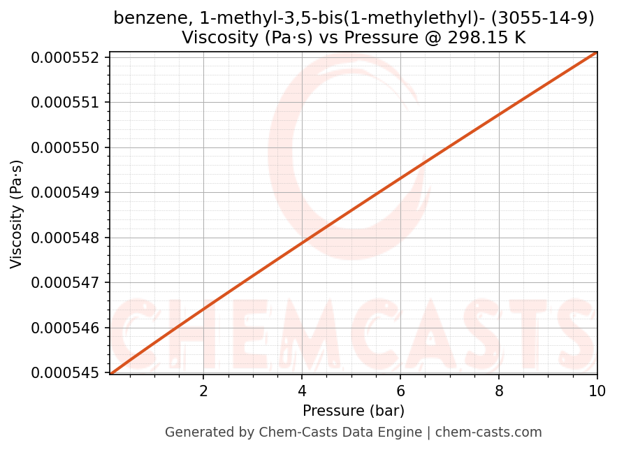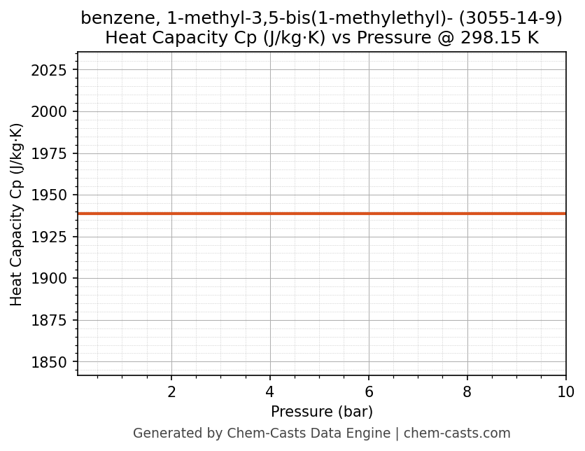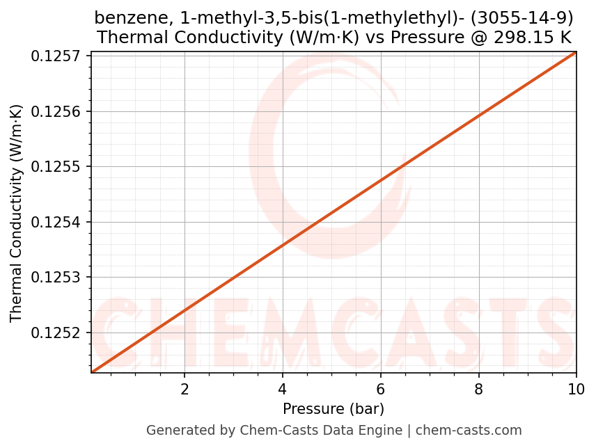 This page presents the pressure-dependent thermodynamic and transport properties of benzene, 1-methyl-3,5-bis(1-methylethyl)- (CAS 3055-14-9) calculated at a constant temperature of 298 K (25 °C) over the pressure range 0.10-10 bar.