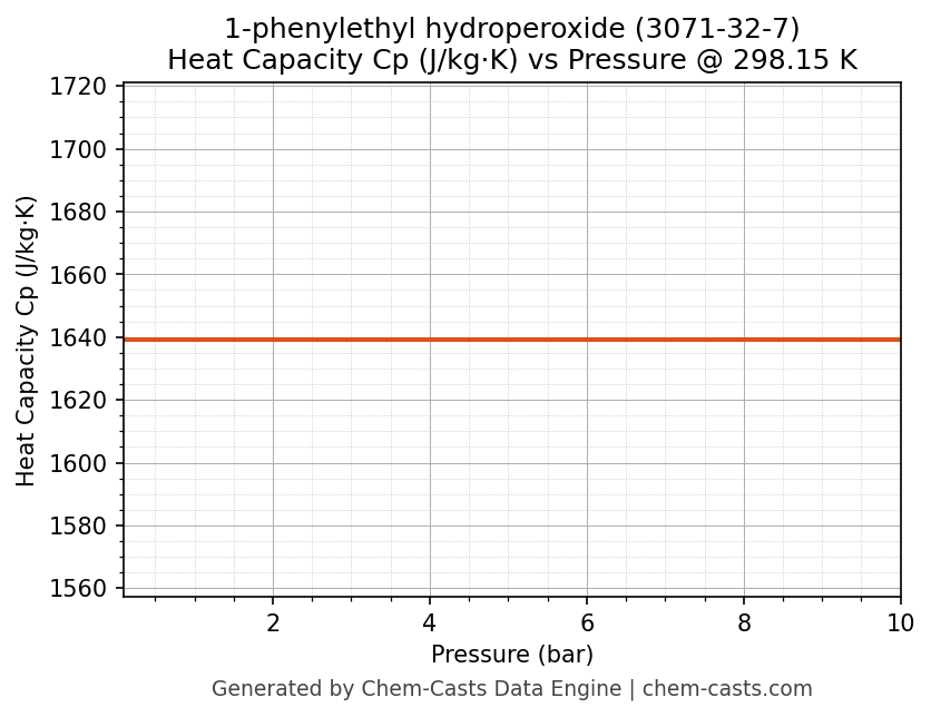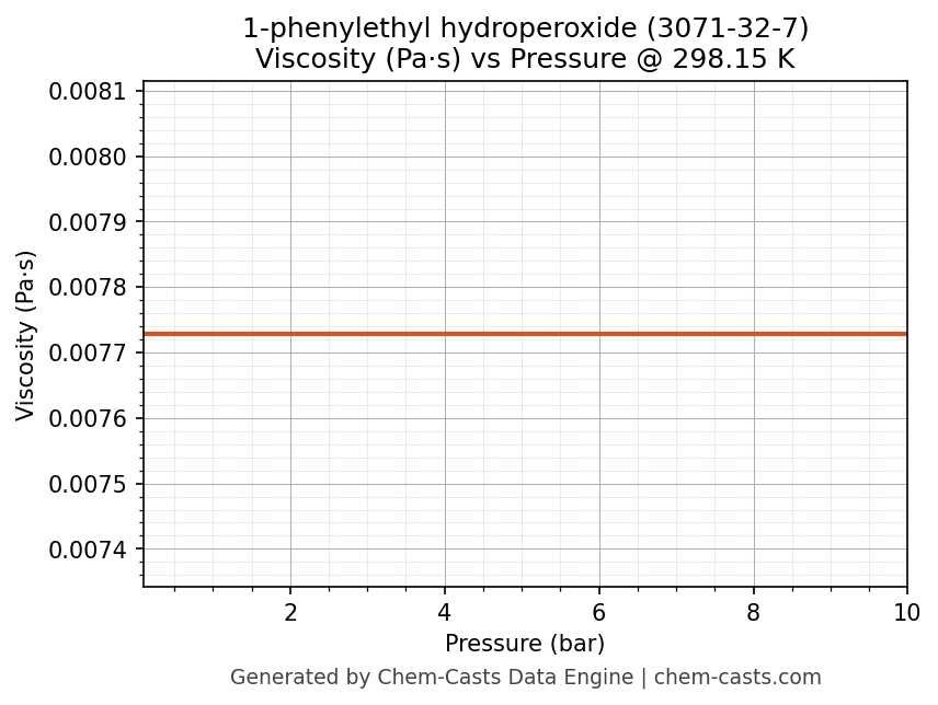 This page presents the pressure-dependent thermodynamic and transport properties of 1-phenylethyl hydroperoxide (CAS 3071-32-7) calculated at a constant temperature of 298 K (25 °C) over the pressure range 0.10-10 bar.