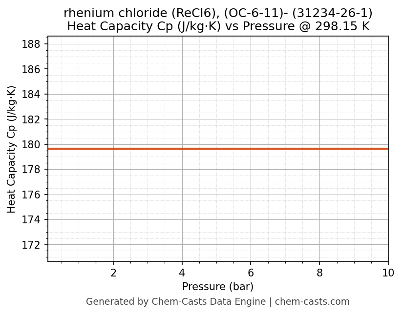 This page presents the pressure-dependent thermodynamic and transport properties of rhenium chloride (ReCl6), (OC-6-11)- (CAS 31234-26-1) calculated at a constant temperature of 298 K (25 °C) over the pressure range 0.10-10 bar.