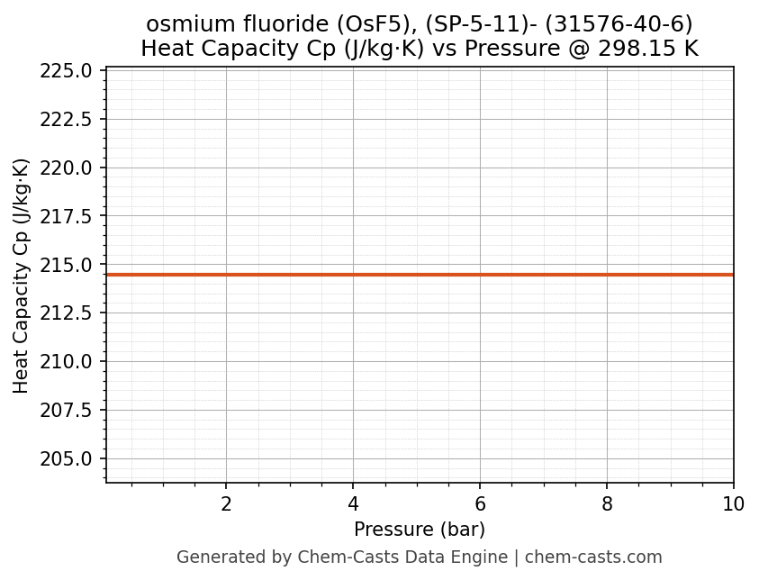 This page presents the pressure-dependent thermodynamic and transport properties of osmium fluoride (OsF5), (SP-5-11)- (CAS 31576-40-6) calculated at a constant temperature of 298 K (25 °C) over the pressure range 0.10-10 bar.
