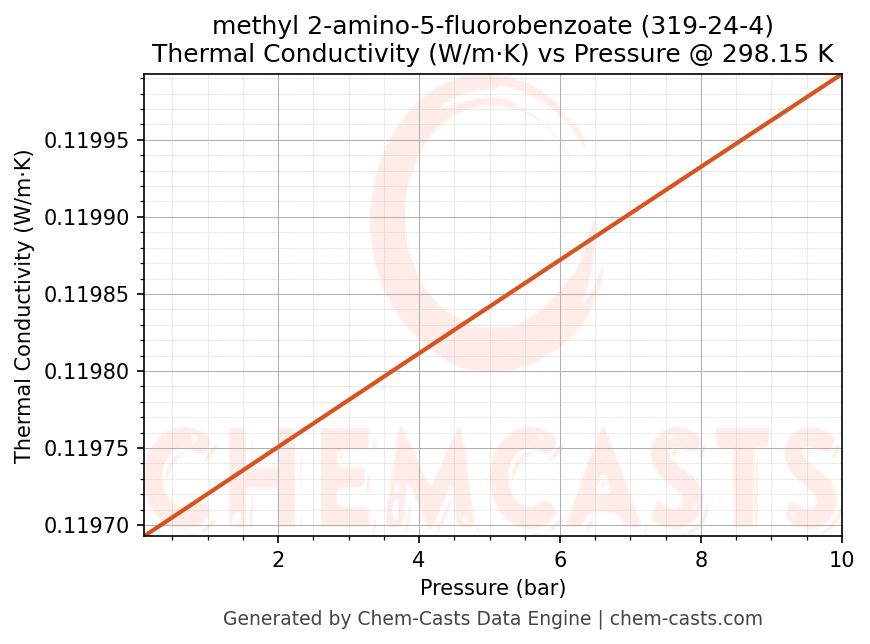This page presents the pressure-dependent thermodynamic and transport properties of methyl 2-amino-5-fluorobenzoate (CAS 319-24-4) calculated at a constant temperature of 298 K (25 °C) over the pressure range 0.10-10 bar.