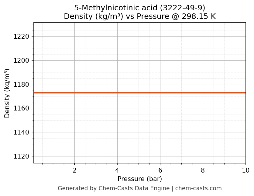 This page presents the pressure-dependent thermodynamic and transport properties of 5-Methylnicotinic acid (CAS 3222-49-9) calculated at a constant temperature of 298 K (25 °C) over the pressure range 0.10-10 bar.