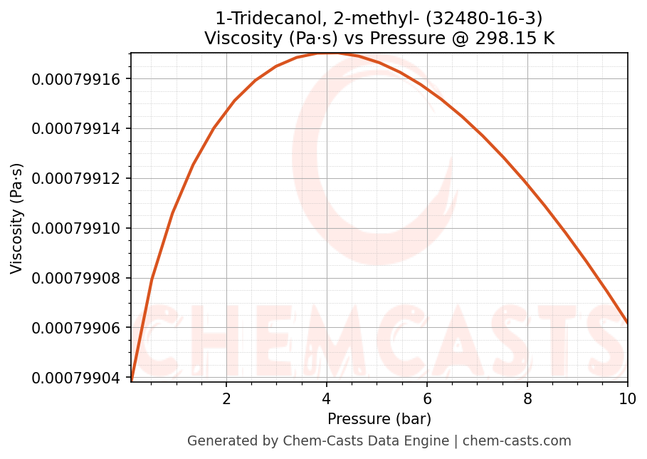 This page presents the pressure-dependent thermodynamic and transport properties of 1-Tridecanol, 2-methyl- (CAS 32480-16-3) calculated at a constant temperature of 298 K (25 °C) over the pressure range 0.10-10 bar.