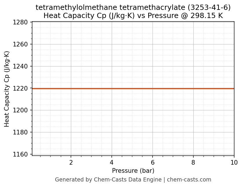This page presents the pressure-dependent thermodynamic and transport properties of tetramethylolmethane tetramethacrylate (CAS 3253-41-6) calculated at a constant temperature of 298 K (25 °C) over the pressure range 0.10-10 bar.