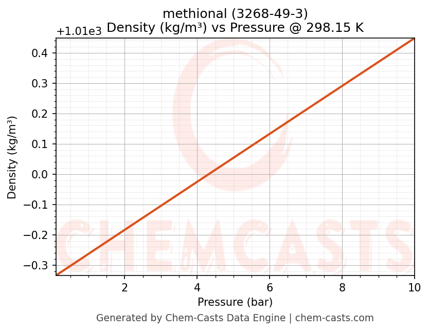 This page presents the pressure-dependent thermodynamic and transport properties of methional (CAS 3268-49-3) calculated at a constant temperature of 298 K (25 °C) over the pressure range 0.10-10 bar.