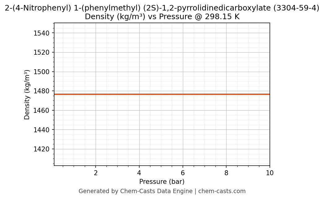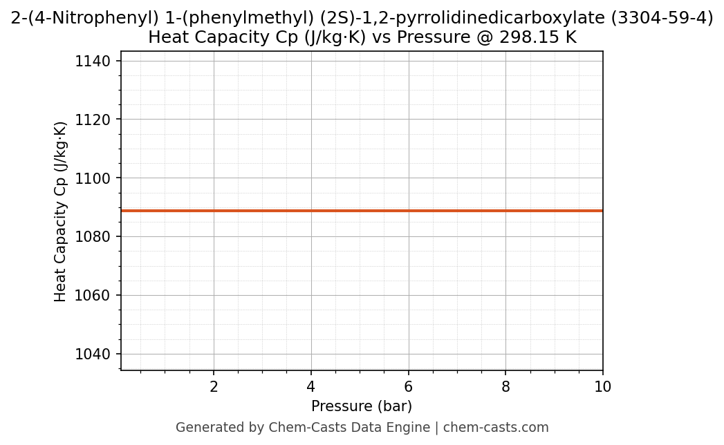 This page presents the pressure-dependent thermodynamic and transport properties of 2-(4-Nitrophenyl) 1-(phenylmethyl) (2S)-1,2-pyrrolidinedicarboxylate (CAS 3304-59-4) calculated at a constant temperature of 298 K (25 °C) over the pressure range 0.10-10 bar.