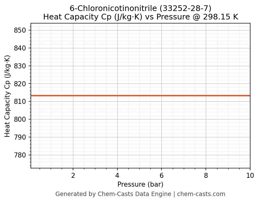 This page presents the pressure-dependent thermodynamic and transport properties of 6-Chloronicotinonitrile (CAS 33252-28-7) calculated at a constant temperature of 298 K (25 °C) over the pressure range 0.10-10 bar.