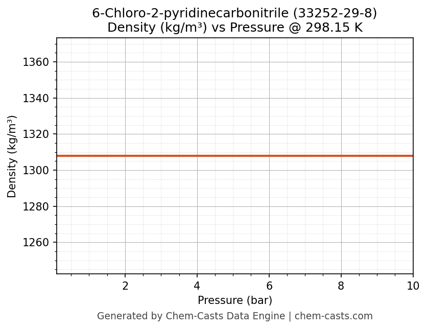 This page presents the pressure-dependent thermodynamic and transport properties of 6-Chloro-2-pyridinecarbonitrile (CAS 33252-29-8) calculated at a constant temperature of 298 K (25 °C) over the pressure range 0.10-10 bar.