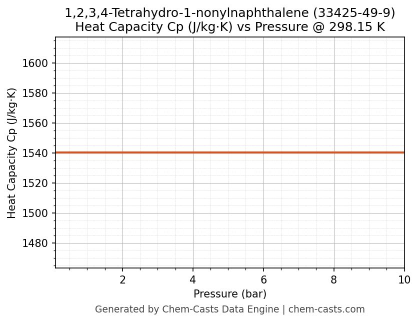 This page presents the pressure-dependent thermodynamic and transport properties of 1,2,3,4-Tetrahydro-1-nonylnaphthalene (CAS 33425-49-9) calculated at a constant temperature of 298 K (25 °C) over the pressure range 0.10-10 bar.