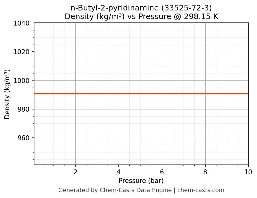 This page presents the pressure-dependent thermodynamic and transport properties of n-Butyl-2-pyridinamine (CAS 33525-72-3) calculated at a constant temperature of 298 K (25 °C) over the pressure range 0.10-10 bar.