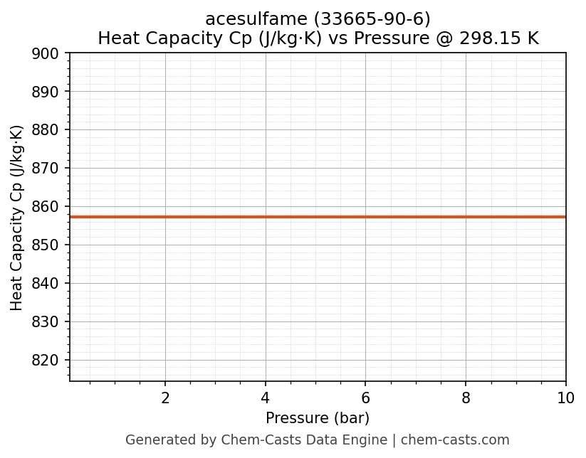 This page presents the pressure-dependent thermodynamic and transport properties of acesulfame (CAS 33665-90-6) calculated at a constant temperature of 298 K (25 °C) over the pressure range 0.10-10 bar.