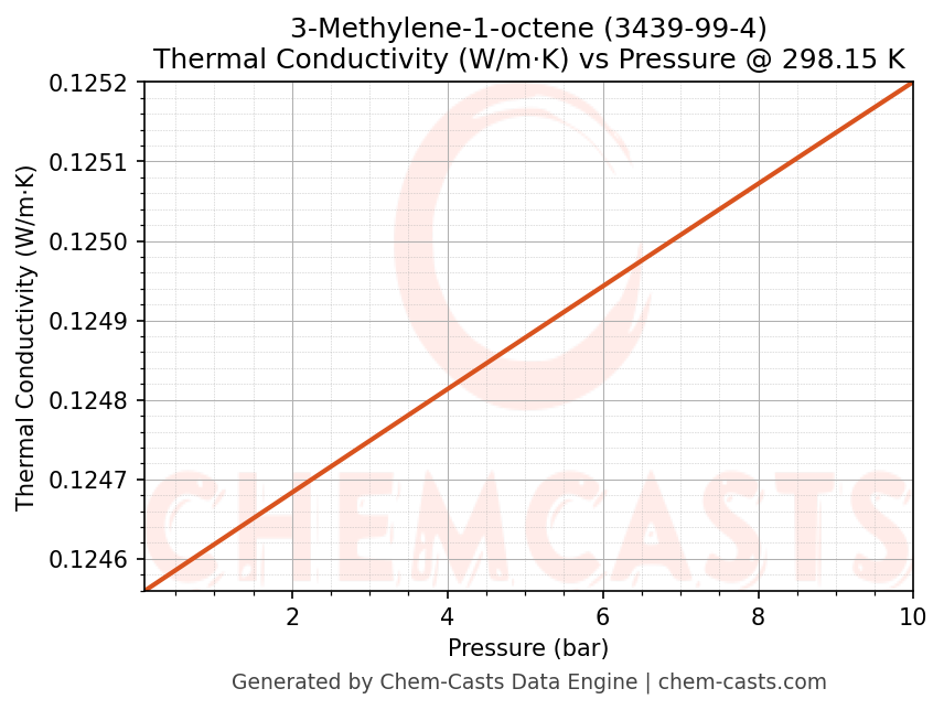 This page presents the pressure-dependent thermodynamic and transport properties of 3-Methylene-1-octene (CAS 3439-99-4) calculated at a constant temperature of 298 K (25 °C) over the pressure range 0.10-10 bar.
