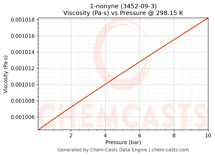 This page presents the pressure-dependent thermodynamic and transport properties of 1-nonyne (CAS 3452-09-3) calculated at a constant temperature of 298 K (25 °C) over the pressure range 0.10-10 bar.