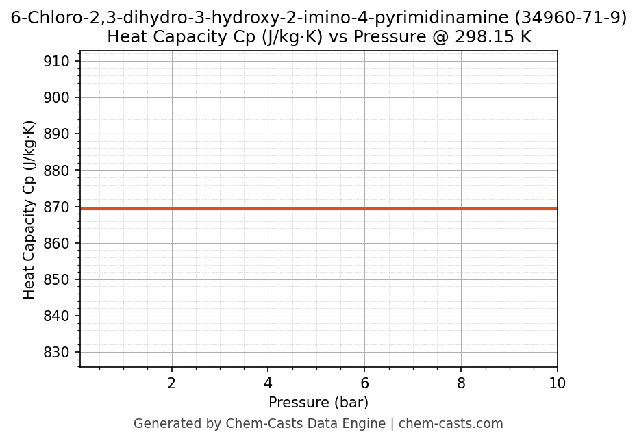 This page presents the pressure-dependent thermodynamic and transport properties of 6-Chloro-2,3-dihydro-3-hydroxy-2-imino-4-pyrimidinamine (CAS 34960-71-9) calculated at a constant temperature of 298 K (25 °C) over the pressure range 0.10-10 bar.