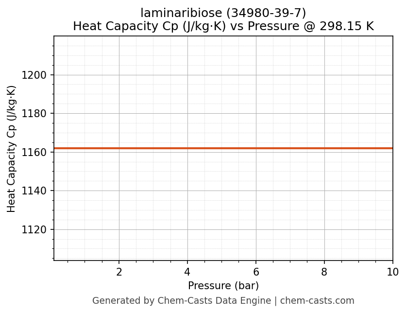 This page presents the pressure-dependent thermodynamic and transport properties of laminaribiose (CAS 34980-39-7) calculated at a constant temperature of 298 K (25 °C) over the pressure range 0.10-10 bar.