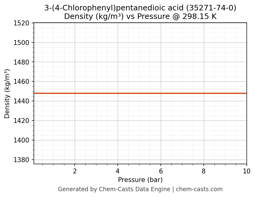 This page presents the pressure-dependent thermodynamic and transport properties of 3-(4-Chlorophenyl)pentanedioic acid (CAS 35271-74-0) calculated at a constant temperature of 298 K (25 °C) over the pressure range 0.10-10 bar.