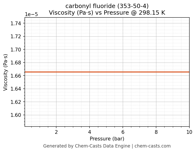 This page presents the pressure-dependent thermodynamic and transport properties of carbonyl fluoride (CAS 353-50-4) calculated at a constant temperature of 298 K (25 °C) over the pressure range 0.10-10 bar.