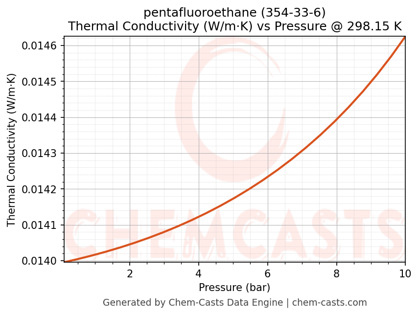 This page presents the pressure-dependent thermodynamic and transport properties of pentafluoroethane (CAS 354-33-6) calculated at a constant temperature of 298 K (25 °C) over the pressure range 0.10-10 bar.