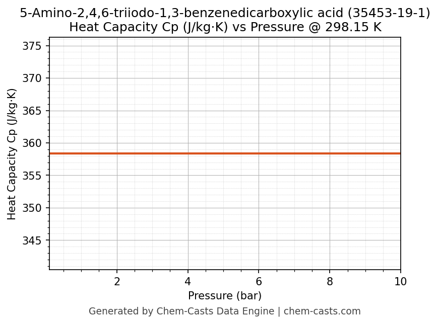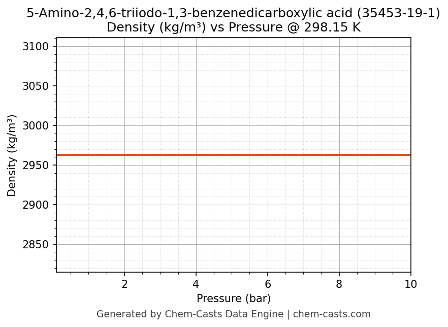 This page presents the pressure-dependent thermodynamic and transport properties of 5-Amino-2,4,6-triiodo-1,3-benzenedicarboxylic acid (CAS 35453-19-1) calculated at a constant temperature of 298 K (25 °C) over the pressure range 0.10-10 bar.