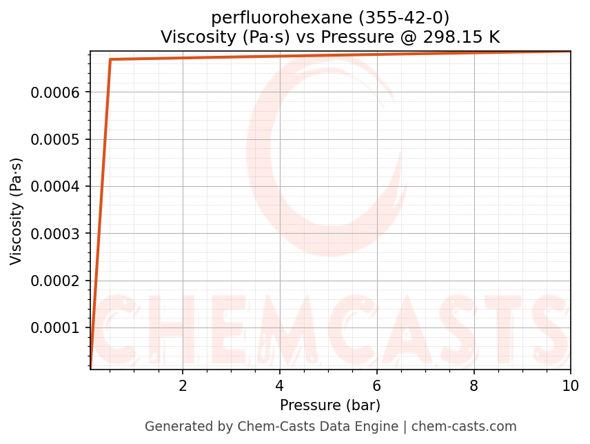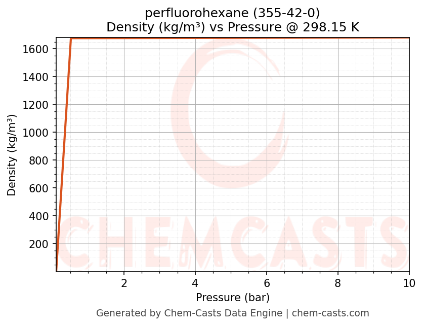 This page presents the pressure-dependent thermodynamic and transport properties of perfluorohexane (CAS 355-42-0) calculated at a constant temperature of 298 K (25 °C) over the pressure range 0.10-10 bar.