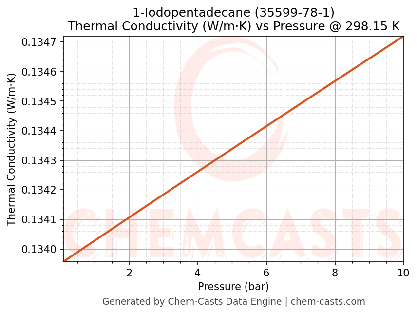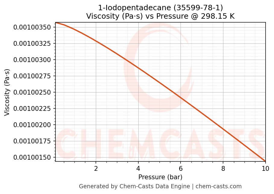 This page presents the pressure-dependent thermodynamic and transport properties of 1-Iodopentadecane (CAS 35599-78-1) calculated at a constant temperature of 298 K (25 °C) over the pressure range 0.10-10 bar.