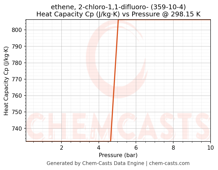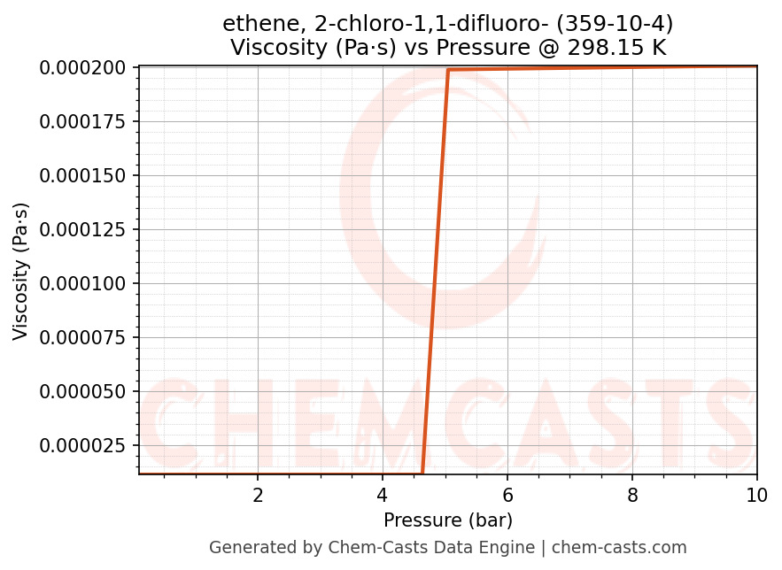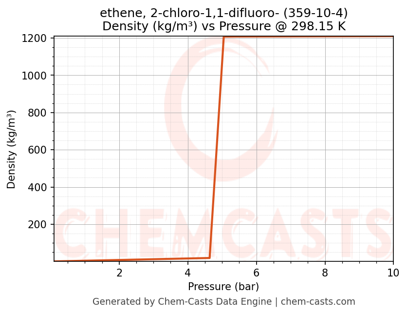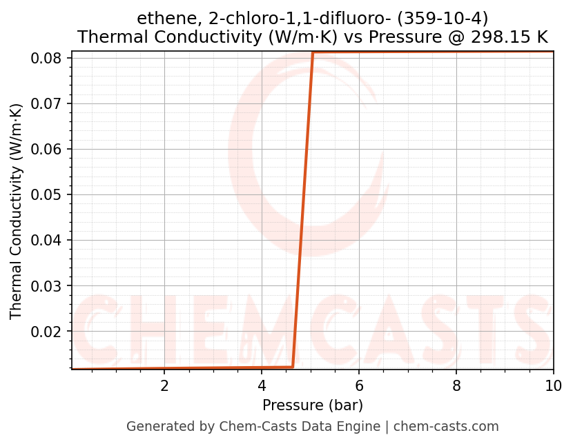 This page presents the pressure-dependent thermodynamic and transport properties of ethene, 2-chloro-1,1-difluoro- (CAS 359-10-4) calculated at a constant temperature of 298 K (25 °C) over the pressure range 0.10-10 bar.