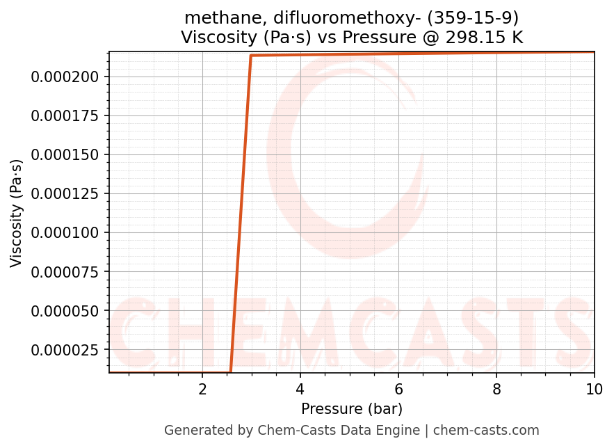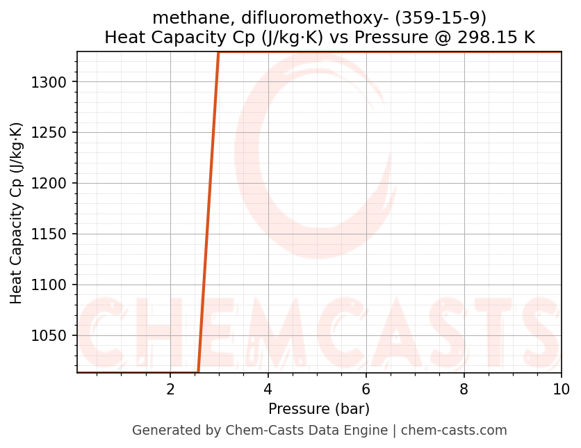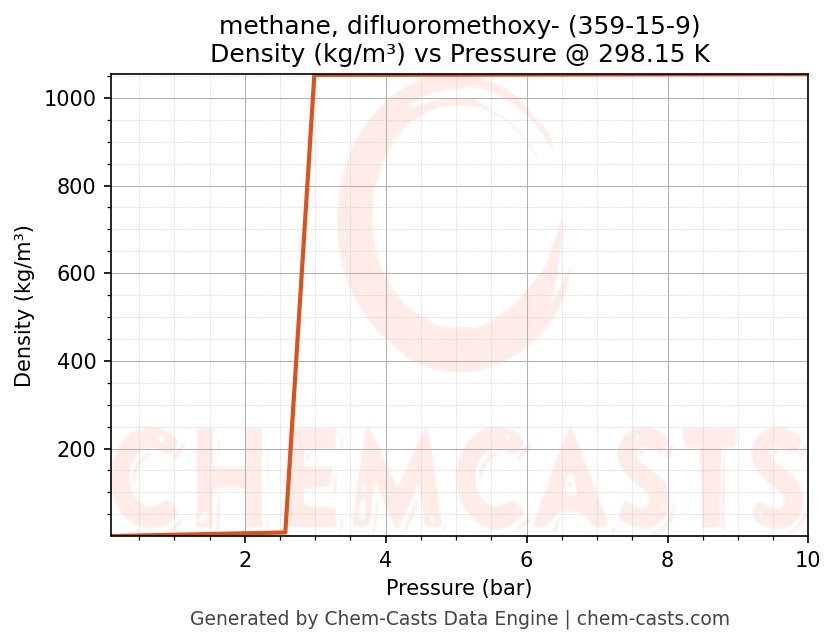 This page presents the pressure-dependent thermodynamic and transport properties of methane, difluoromethoxy- (CAS 359-15-9) calculated at a constant temperature of 298 K (25 °C) over the pressure range 0.10-10 bar.
