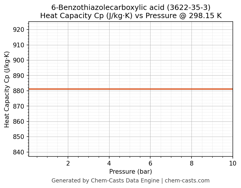 This page presents the pressure-dependent thermodynamic and transport properties of 6-Benzothiazolecarboxylic acid (CAS 3622-35-3) calculated at a constant temperature of 298 K (25 °C) over the pressure range 0.10-10 bar.