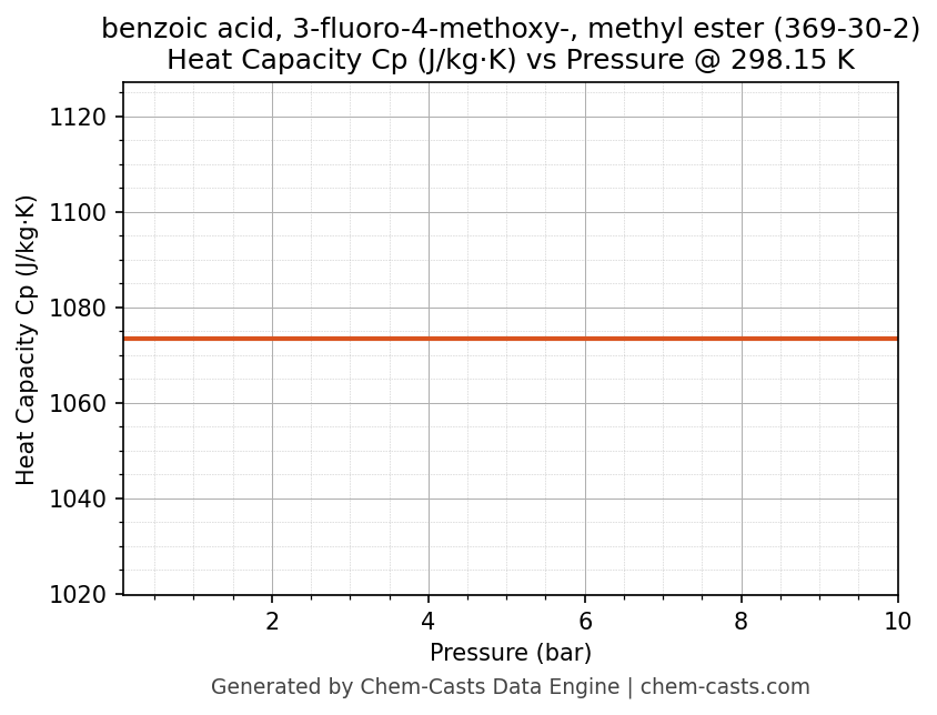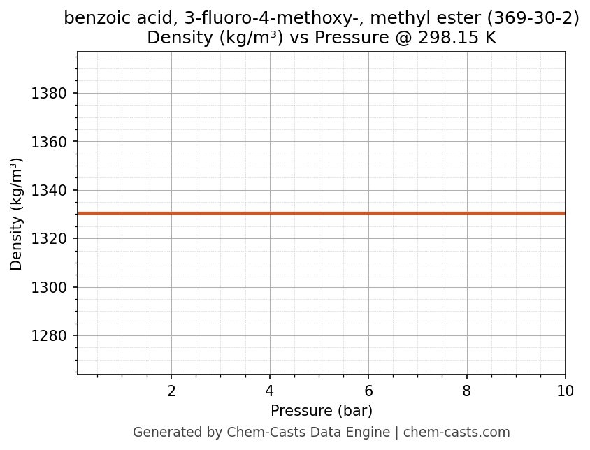 This page presents the pressure-dependent thermodynamic and transport properties of benzoic acid, 3-fluoro-4-methoxy-, methyl ester (CAS 369-30-2) calculated at a constant temperature of 298 K (25 °C) over the pressure range 0.10-10 bar.