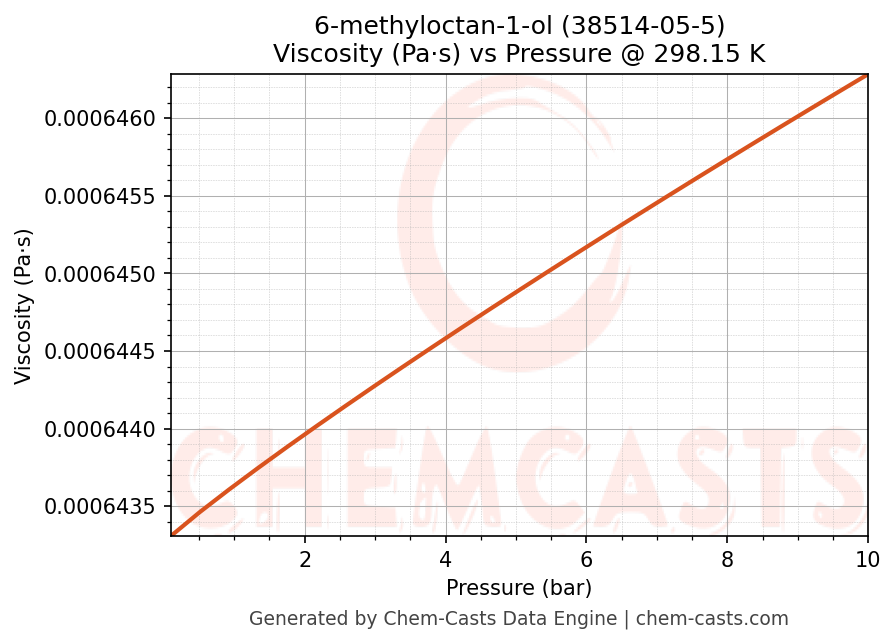 This page presents the pressure-dependent thermodynamic and transport properties of 6-methyloctan-1-ol (CAS 38514-05-5) calculated at a constant temperature of 298 K (25 °C) over the pressure range 0.10-10 bar.