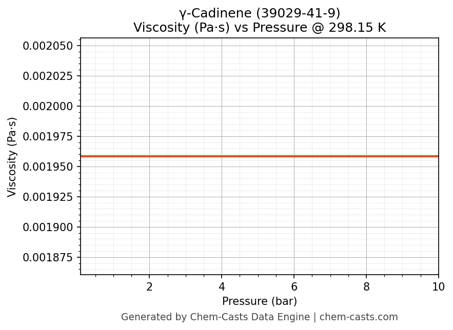 This page presents the pressure-dependent thermodynamic and transport properties of γ-Cadinene (CAS 39029-41-9) calculated at a constant temperature of 298 K (25 °C) over the pressure range 0.10-10 bar.