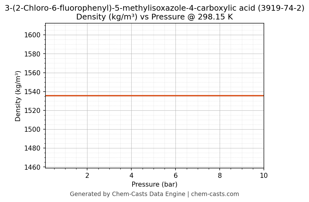 This page presents the pressure-dependent thermodynamic and transport properties of 3-(2-Chloro-6-fluorophenyl)-5-methylisoxazole-4-carboxylic acid (CAS 3919-74-2) calculated at a constant temperature of 298 K (25 °C) over the pressure range 0.10-10 bar.