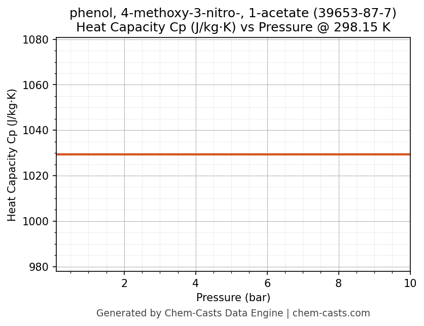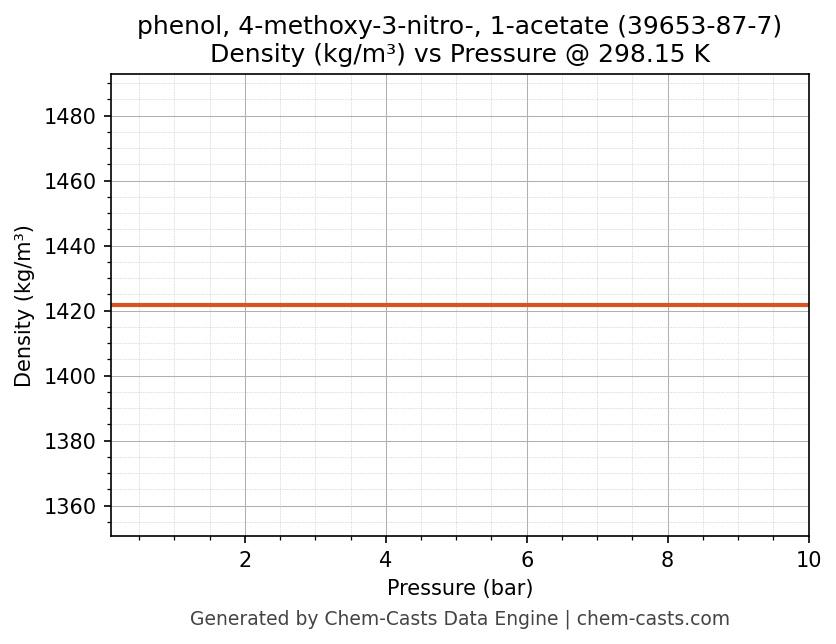 This page presents the pressure-dependent thermodynamic and transport properties of phenol, 4-methoxy-3-nitro-, 1-acetate (CAS 39653-87-7) calculated at a constant temperature of 298 K (25 °C) over the pressure range 0.10-10 bar.