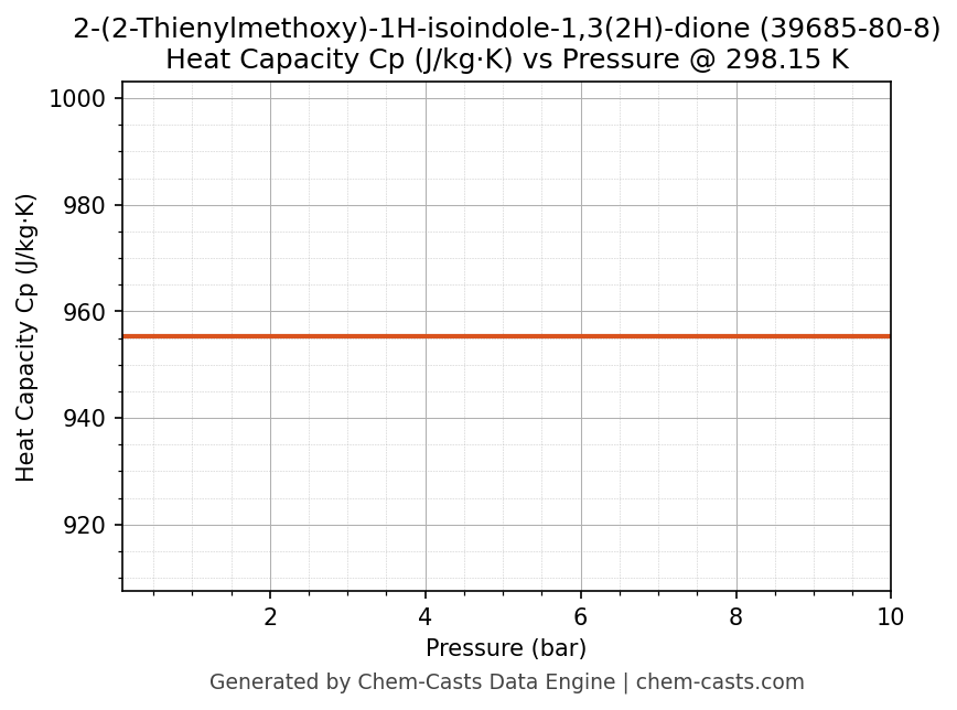 This page presents the pressure-dependent thermodynamic and transport properties of 2-(2-Thienylmethoxy)-1H-isoindole-1,3(2H)-dione (CAS 39685-80-8) calculated at a constant temperature of 298 K (25 °C) over the pressure range 0.10-10 bar.
