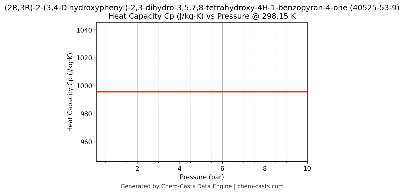 This page presents the pressure-dependent thermodynamic and transport properties of (2R,3R)-2-(3,4-Dihydroxyphenyl)-2,3-dihydro-3,5,7,8-tetrahydroxy-4H-1-benzopyran-4-one (CAS 40525-53-9) calculated at a constant temperature of 298 K (25 °C) over the pressure range 0.10-10 bar.