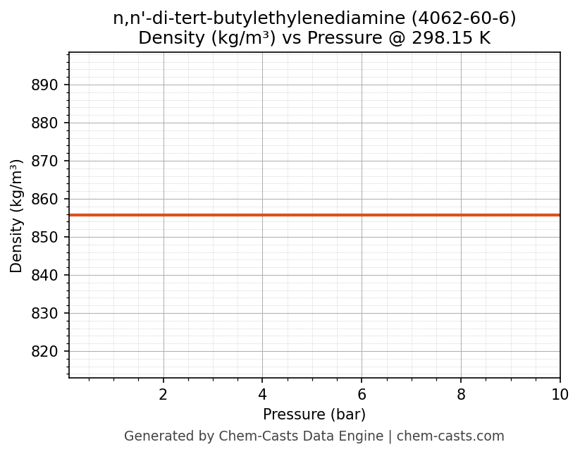 This page presents the pressure-dependent thermodynamic and transport properties of n,n'-di-tert-butylethylenediamine (CAS 4062-60-6) calculated at a constant temperature of 298 K (25 °C) over the pressure range 0.10-10 bar.