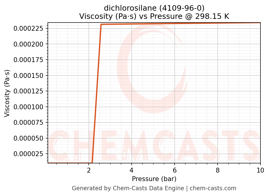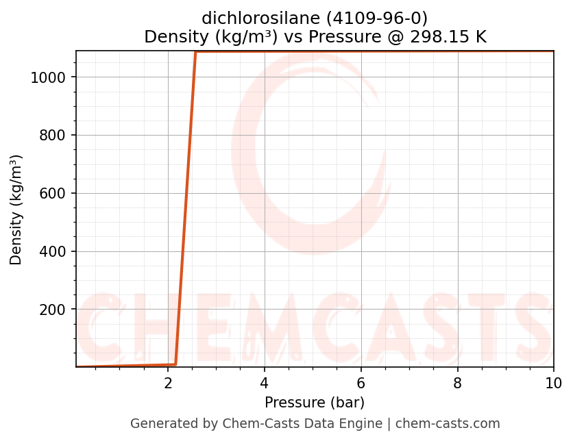 This page presents the pressure-dependent thermodynamic and transport properties of dichlorosilane (CAS 4109-96-0) calculated at a constant temperature of 298 K (25 °C) over the pressure range 0.10-10 bar.