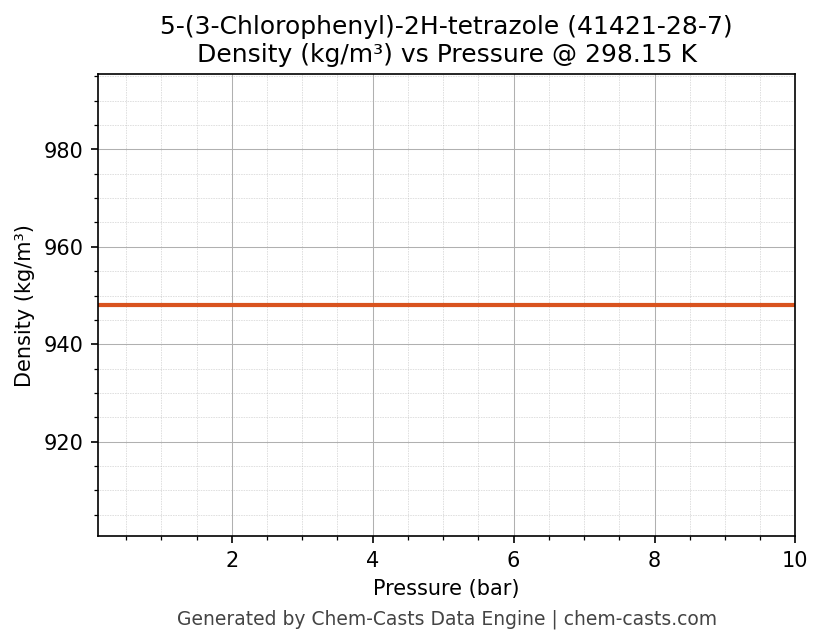 This page presents the pressure-dependent thermodynamic and transport properties of 5-(3-Chlorophenyl)-2H-tetrazole (CAS 41421-28-7) calculated at a constant temperature of 298 K (25 °C) over the pressure range 0.10-10 bar.
