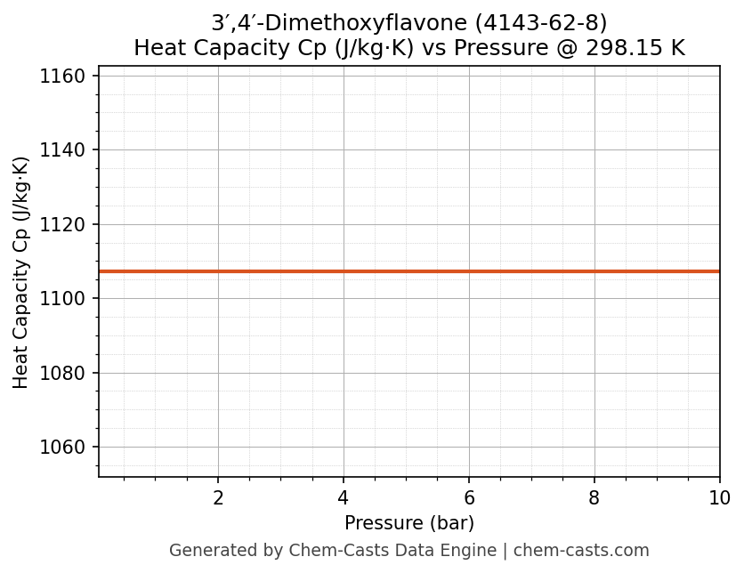This page presents the pressure-dependent thermodynamic and transport properties of 3′,4′-Dimethoxyflavone (CAS 4143-62-8) calculated at a constant temperature of 298 K (25 °C) over the pressure range 0.10-10 bar.
