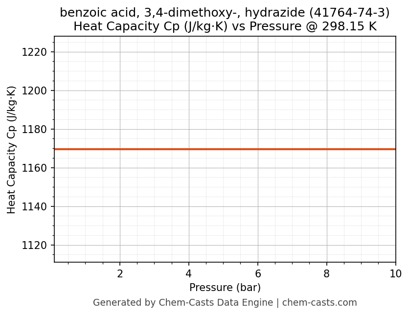 This page presents the pressure-dependent thermodynamic and transport properties of benzoic acid, 3,4-dimethoxy-, hydrazide (CAS 41764-74-3) calculated at a constant temperature of 298 K (25 °C) over the pressure range 0.10-10 bar.