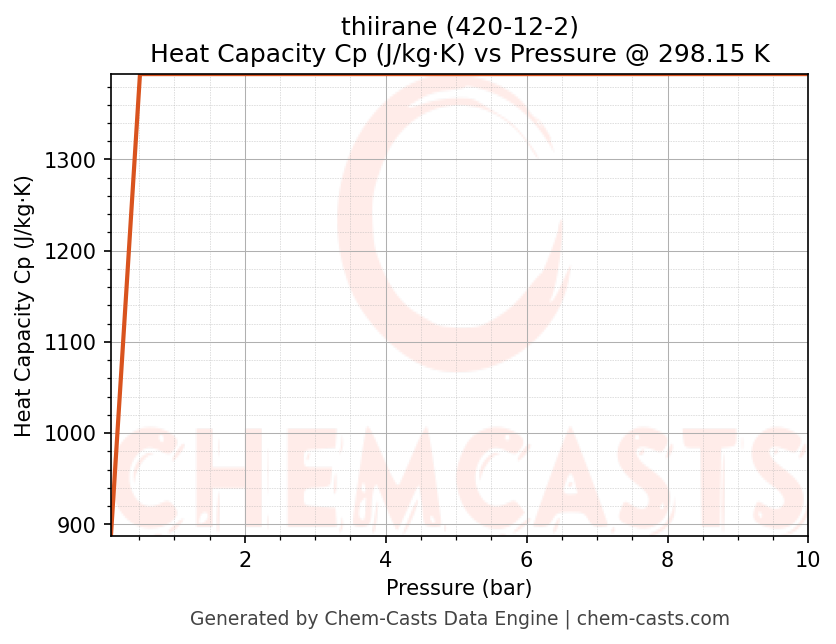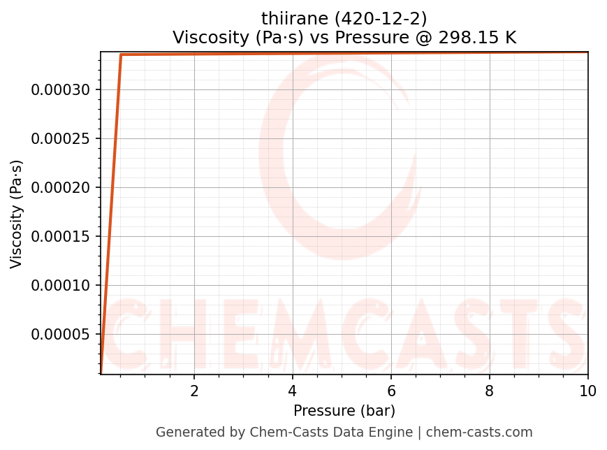 This page presents the pressure-dependent thermodynamic and transport properties of thiirane (CAS 420-12-2) calculated at a constant temperature of 298 K (25 °C) over the pressure range 0.10-10 bar.